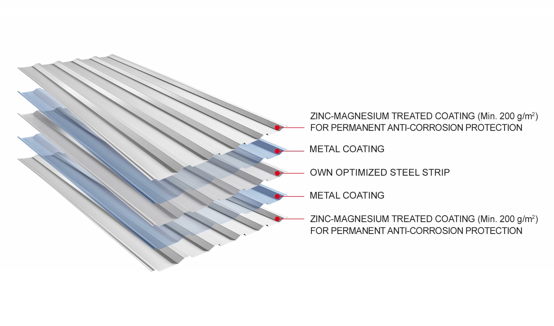 Steel is an alloy of iron and carbon with a maximum carbon content of 2.14 %. Steel, a metal alloy with iron as the main component, is especially valued for its mechanical stability and load-bearing capacity. The use of a thin film of zinc protects steel against corrosion. About half of the world yield of zinc is used for galvanizing and thus also for corrosion protection.