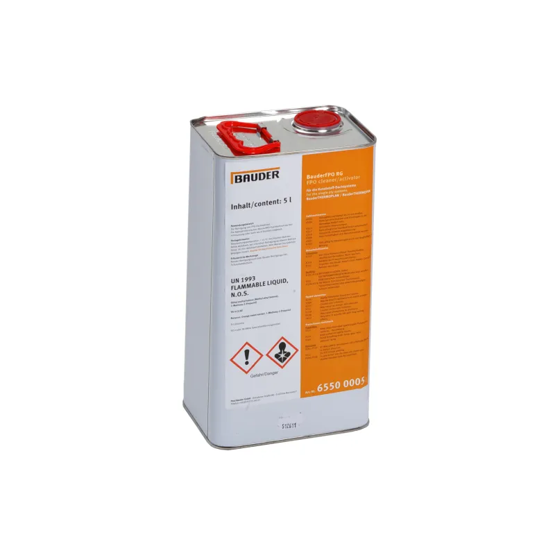 Cleaning agent for preparation of BauderTHERMOPLAN / BauderTHERMOFIN PVC roofing foils. Apply BauderFPO RG cleaner activator to the contaminated areas using a clean, soft cloth and wipe dry. Ideally, use BauderSYN RET-N cleaning wipes. For heavily soiled areas, repeat the process with another cleaning agent and a new cloth. Allow the cleaned areas to dry thoroughly.
