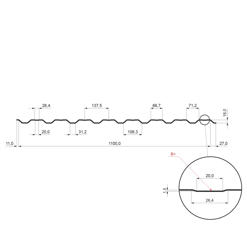 It contains a shaped rib which is designed to increase the load-bearing capacity and improves the visual aspect of the trapezoidal sheet.