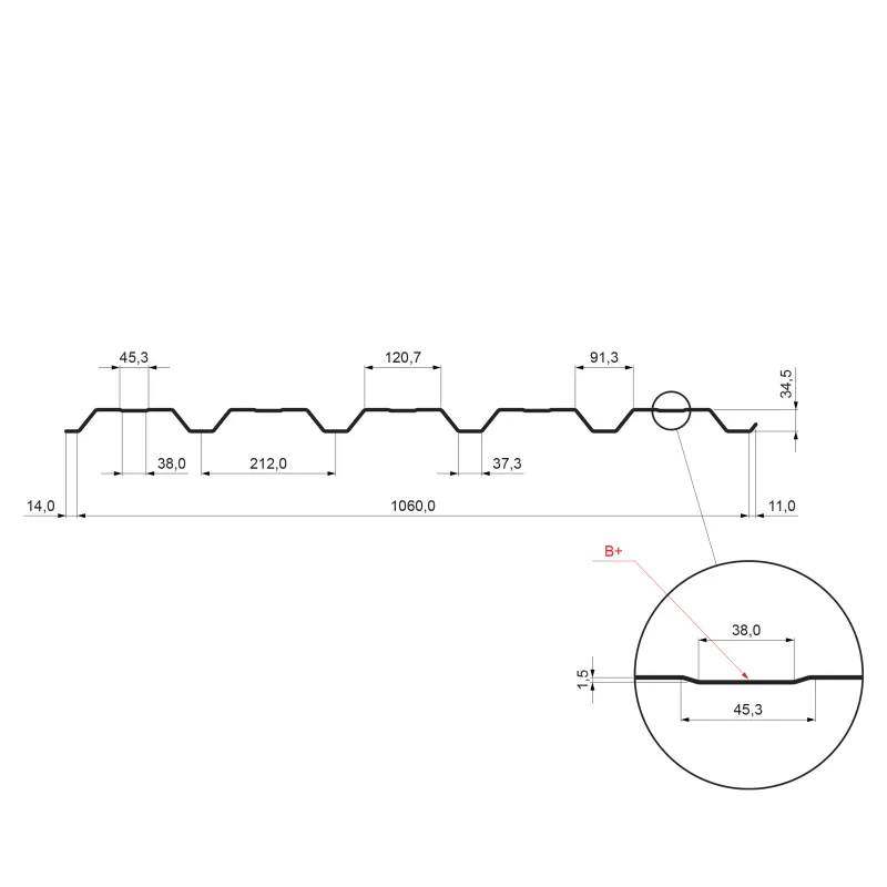 It contains a shaped rib which is designed to increase the load-bearing capacity and improves the visual aspect of the trapezoidal sheet.