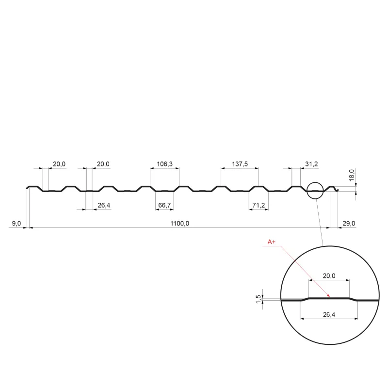 The profile TR 18A+ is designed for a roof surface with a minimum pitch of 8° without a cross joint and of 10° with a cross joint, with an overlap of min. 200 mm. The shaped rib is designed to increase the load-bearing capacity and improves the visual aspect of the trapezoidal sheet.