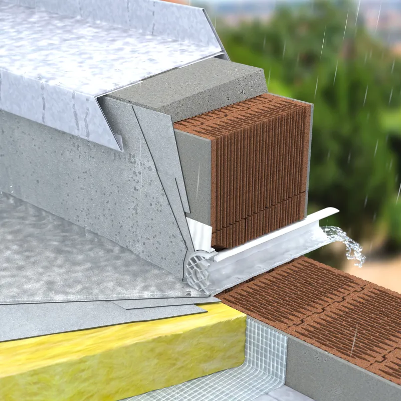 Round spout TOPWET with integrated sealing collar made of PVC-based waterproofing membrane and protective grid.