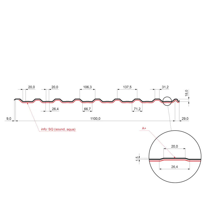 Profil TR 18A+ SQ je namenjen za površino strehe z minimalnim naklonom 8° brez prečnega spoja in 10° s prečnim spojem, s prekritjem min. 200 mm. Odtis je namenjen za povečanje nosilnosti in izboljšanje vizualne plati trapeza.
