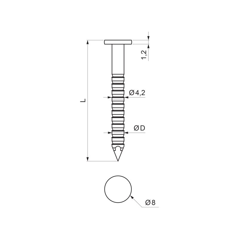 Konveksni žebelj za lepenko za pritrditev tankih materialov na lesena ogrodja podlage.